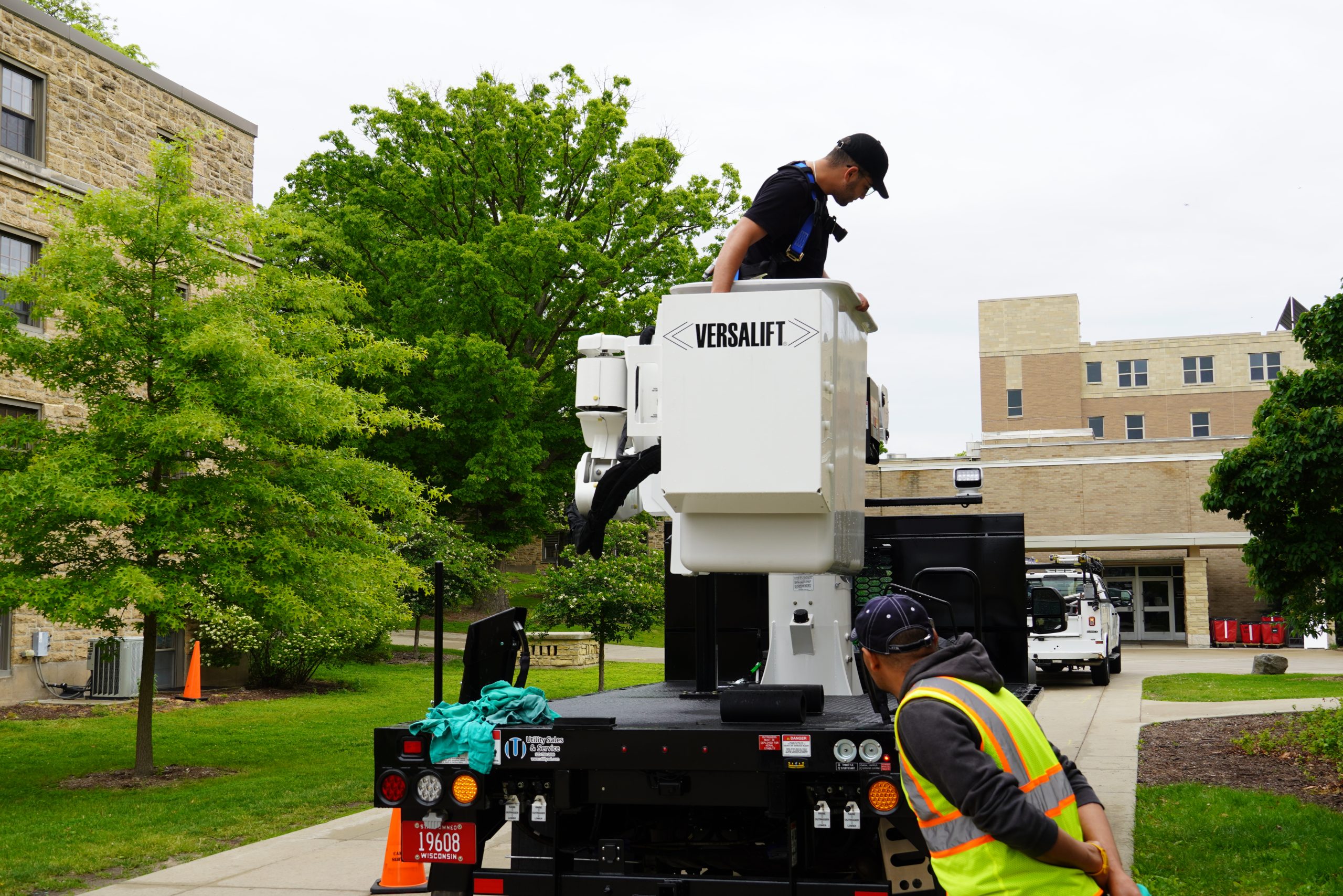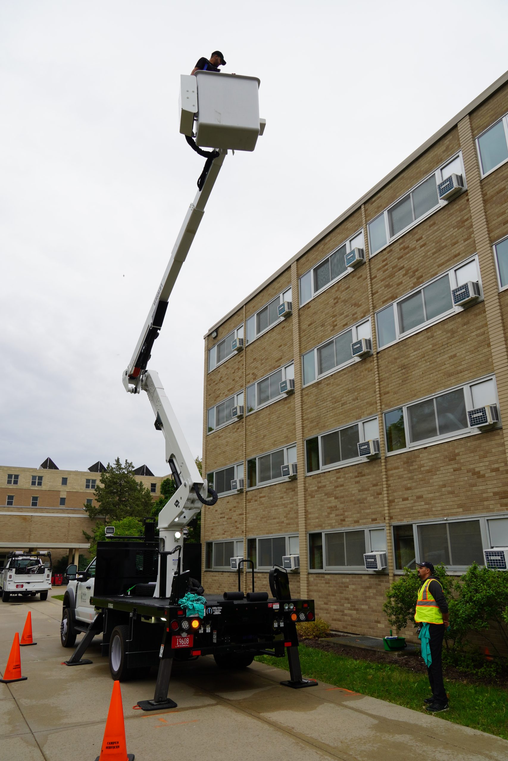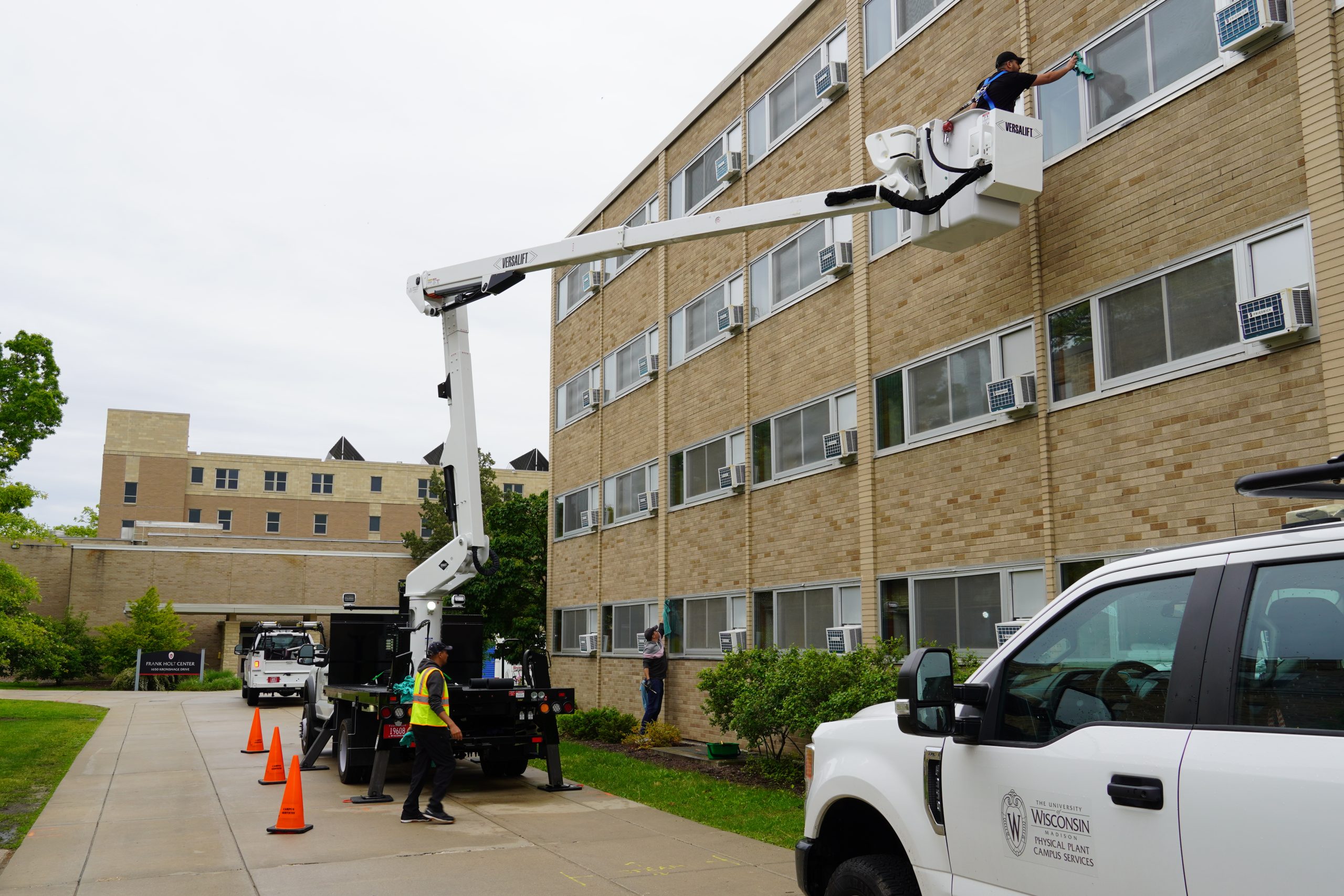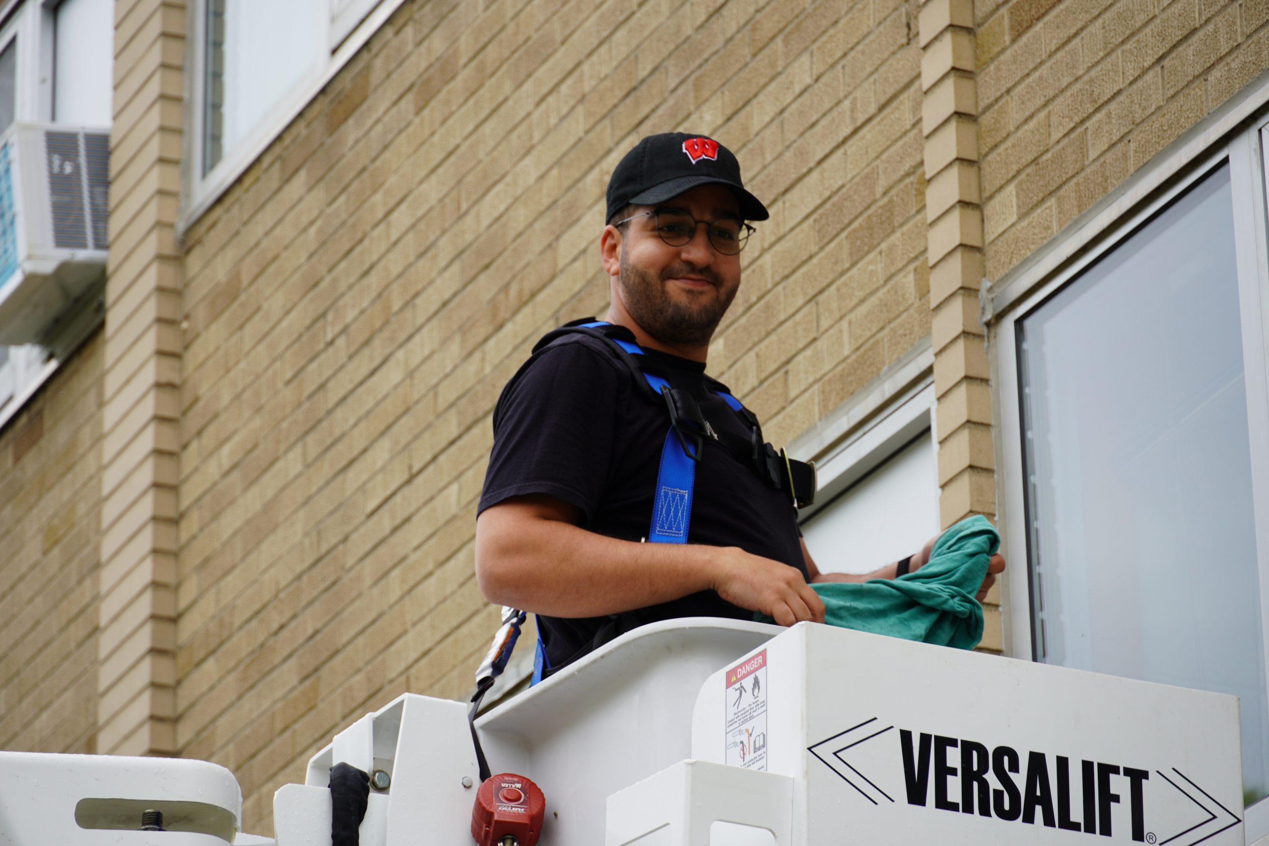 The group cleans interior and exterior windows on campus and some buildings can take weeks to complete. Using boom lifts, the team often works at heights of over 100 feet, responsible for operating the machine and cleaning the windows.